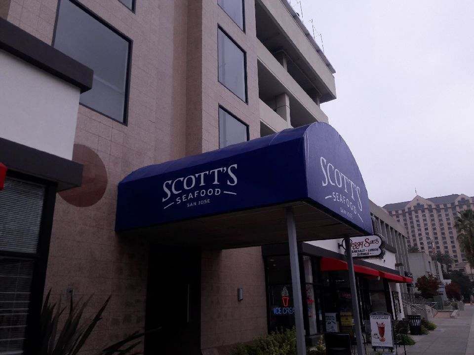 Curved custom canopy in Sunflower Yellow Sunbrella with clear roll down curtains.